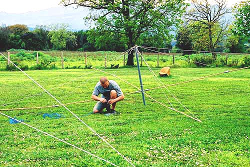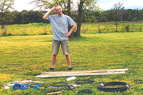 Wszystko, co związane z antenami ląduje na trawniku, zaczyna się mozolny montaż. Konstrukcja musi wytrzymać przynajmniej do niedzielnego popołudnia. Anteny: VK2ABQ na 20, 15, 10, zasilane z jednego baluna, oraz dipole 40, 80, zasilane z drugiego baluna. Maszt wysoki na sześć metrów bez anteny prezentuje się naprawdę nieźle.