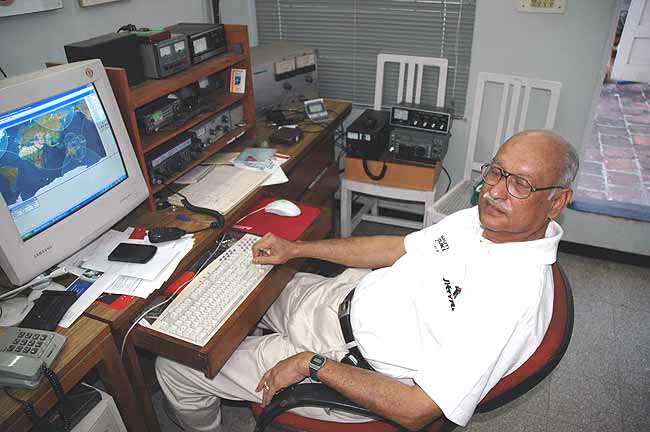 Devadas, VU2DH przy swojej radiostacji w mieście Chennai tydzień po tsunami 26 grudnia 2004. |