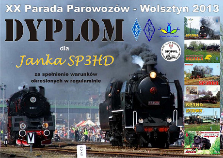 Autor: Krzysztof SQ3JPDZ okazji XX Jubileuszowej Parady Parowozów, która odbędzie się w Wolsztynie 27 kwietnia 2013 roku Wolsztyński Klub Krótkofalowców SP3PWL postanowił wydać okolicznościowy dyplom.