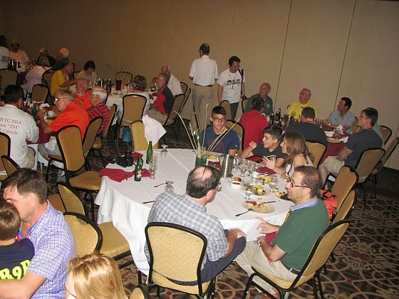 Po powrocie z wycieczki zostało niewiele czasu na przygotowanie do ceremonii ogłoszenia wyników. Stroje (dress code) to raczej długie spodnie. Włożyłem czerwoną koszulkę sędziego - tę oficjalną z kołnierzykiem. Uroczystość zaczęła się od posiłku przy stole szwedzkim i drinkach w cash bar. Następnie jeden ze sponsorów biura turystycznego Wysp Azorskich na Atlantyku (wyspy należą do Portugalii) przedstawił ciekawą i humorystyczną prezentacje walorów turystycznych tego rejonu również pod kątem nadawania na radiostacji. Po tych elementach ceremonii zaczęła się prezentacja wyników. Wcześniej jednak nagrodzono wolontariusza za poświecenie mimo poważnego skaleczenia nogi od wbijanego słupka stalowego na odciągi masztu. Skaleczenie wymagało interwencji chirurga, ale wolontariusz był już następnego dnia na swoim posterunku. Nagradzano teamy za największą liczbę łączności telegraficznych, fonicznych, największy uzyskany mnożnik, najlepszą jakość pracy czyli braku błędów w znakach i odebranych raportach (tu nagrodę dostał "mój" team W1P - utrata tylko 1% punktów). Pomyślałem, że to dobry znak aby mój team mógł się przesunąć wyżej w ostatecznej kwalifikacji zważywszy na niewielkie różnice miedzy drużynami na 3-4-5 miejscu. No i w zasadzie od razu okazało się po dramatycznej opowieści Dave'a K1ZZ o ciężkiej pracy i trudnych decyzjach komitetu WRTC, że 3 miejsce zajął właśnie mój team "W1Polska". Na drugim miejscu byli Słowacy a pierwsze miejsce zajęli Amerykanie. Zdjęć i fanfar było mnóstwo. Radości no i smutki niektórych. Jednak najważniejsze jest to ze wszystkim udzieliła się dobra atmosfera, a wysiłek w pracy na radiostacji pozostał jako piękne i niezapomniane wspomnienie przeżytych chwil. Zdjęcia z gali: