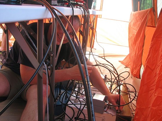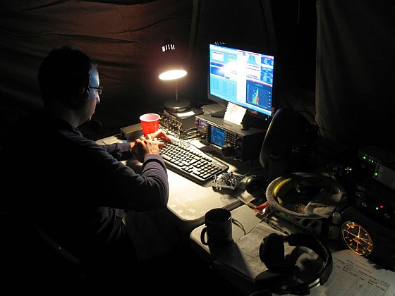 No i rozpoczęli rozwijanie sprzętu. Mozolnie każdy pakunek z walizek po wyjęciu rozwijali i ustawiali na stoliku w odpowiednim miejscu i łączyli kabelkami, w zapasie mieli też radio rezerwowe backup - wszystkie radia to IC756PRO3 firmy Icom. Po połączeniu przyszedł czas na próby i sprawdzenie parametrów anten.