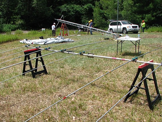 Następnego dnia od rana wszyscy zagrali larum i do budowy stanowisk. Szło to całkiem zgrabnie mimo potężnego upału. Oczywiście do momentu postawienia masztu trzeba było złożyć antenę kierunkową, przygotować dipole, wbić kołki do odciągów.