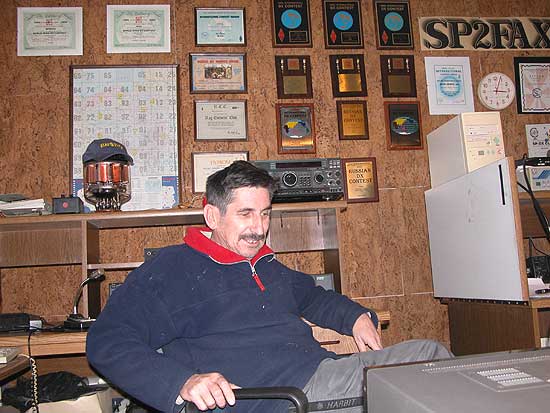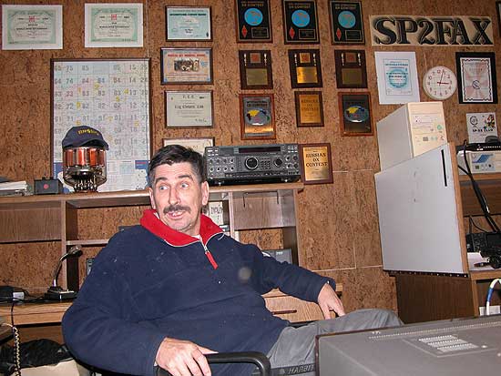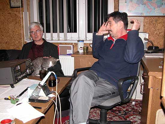 W pewien sobotni wieczór wraz z Marianem SP5HRX wyl±dowali¶my na stacji paliwowej w Ko³aczkowie. Indagowany pan bez zaj±kniêcia wyrecytowa³ jak trafiæ do tego faceta od anten. Kilka minut pó¼niej zastukali¶my do Kazikowych drzwi, funduj±c mu darmow± atrakcjê oprowadzania kolejnej wycieczki. W ten¿e wieczór oba "koszmarne" warunki zosta³y spe³nione, lecz Kazio z u¶miechem rzek³: warunkowo was ugoszczê albowiem nie ma warunków na 10m. Po czê¶ci oficjalnej zapadli¶my w wygodnych siedziskach racz±c siê kaw± ci, co mogli, a herbat± ten co nie. Pomiêdzy ³ykami, domowy koteczek pozwala³ dopieszczaæ siê, równie¿ za uszami.