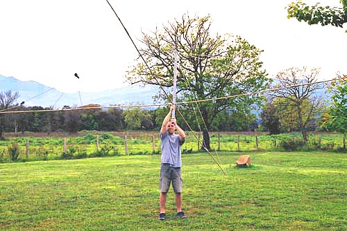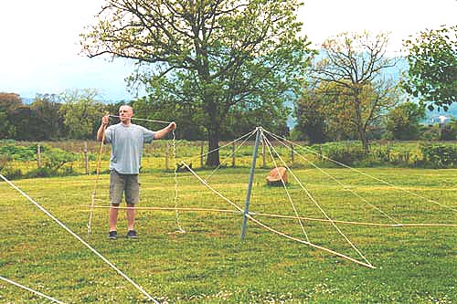 Wszystko, co związane z antenami ląduje na trawniku, zaczyna się mozolny montaż. Konstrukcja musi wytrzymać przynajmniej do niedzielnego popołudnia. Anteny: VK2ABQ na 20, 15, 10, zasilane z jednego baluna, oraz dipole 40, 80, zasilane z drugiego baluna. Maszt wysoki na sześć metrów bez anteny prezentuje się naprawdę nieźle.