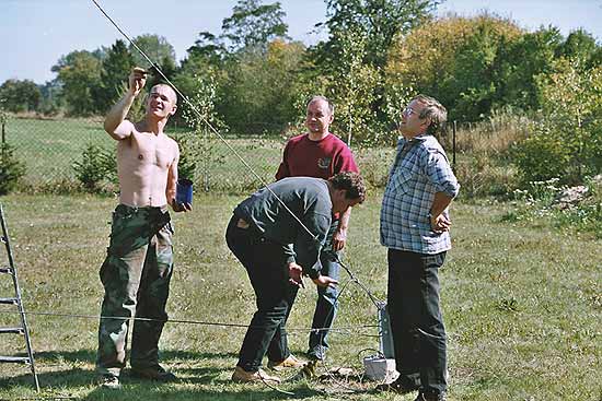 Aby antena funkcjonowała dobrze nie wystarczy poświęcenie jej przez przedstawiciela kościoła. Odwrotnie, stwarza to wyjątkowe luki w charakterystyce promieniowania anteny, która działa tylko na regiony objęte tym właśnie kościołem. Po to aby mieć dobry sygnał w innych rejonach trzeba odprawić selektywne modły. Na zdjęciu Jurek SP3GEM na kolanach zwrócony w odpowiednim kierunku przy swojej nowej antenie na 80 metrów. Po modłach zrobił 100 łączności ze stacjami HZ na 3.8 MHz z raportami 59.