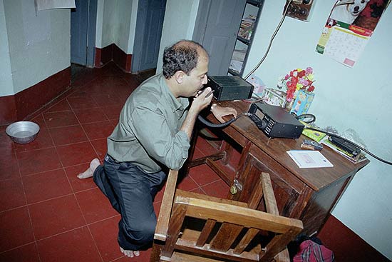 Od 1-go kwietnia 2005 weryfikacja kart do DXCC będzie wymagała dodatkowych informacji, np. jaka antena była użyta do łączności i którą drogą szła fala elektromagnetyczna. Na zdjęciu Falk DK7YY, DXCC Card Checker, przesłuchuje krótkofalowca, który dokładnie pokazuje drogę swoich fal elektromagnetycznych w łączności z Koreą Północną długą drogą (long path propagation)
