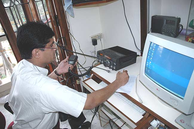 Devadas, VU2DH przy swojej radiostacji w mieście Chennai tydzień po tsunami 26 grudnia 2004. |