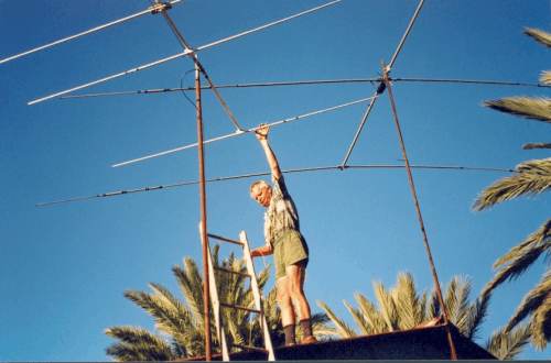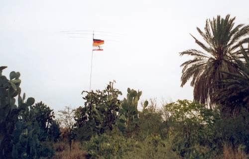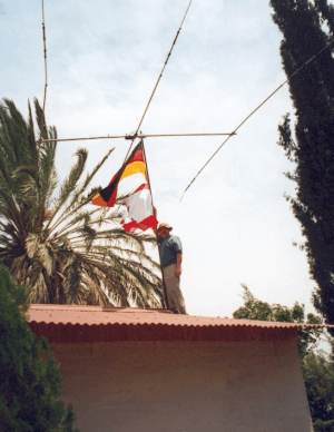 Następnego dnia w czasie śniadania rozmawiamy na temat anten które są zamontowane ~3 m nad blaszanym dachem, w buszu było by im lepiej. Reiner w niezrozumiałym nam języku rozmawia z dwoma czarnymi tubylcami, biorą taczkę, cement i łopaty, będzie nowy maszt. 15 metrów od domku, zabetonowana jest podstawa i winda do podnoszenia, 12 metrów masztu z rur stalowych czeka na związanie betonu. Przenosimy anteny, minął ponad tydzień od przyjazdu, można powiedzieć, że wiem co gdzie i kiedy. Ok 6 UTC 14MHz W6, W7, VE 6 propagacja ok. 40 minut silnie i krótko, śniadanie i po śniadaniu anteny na LP w kierunku JA i taka sama historia ~30 - 40 minut Japonia potem kilka HL, DS i trzeba się obracać na EU.